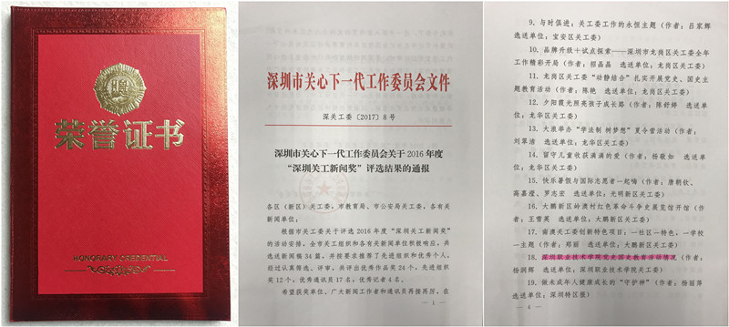 深圳市关工委11月份发布了《深圳市关心下一代工作委员会2016年度“深圳关工新闻奖”评选结果的通报》(深关工委[2017]8号文),我校关工委选送的《深圳职业技术学院党史国史教育活动情况》一文,荣获2016年度“深圳关工新闻奖”“优秀作品奖”,为全市24篇获奖优秀作品之一,撰写者杨润辉同时获得了“荣誉证书”。