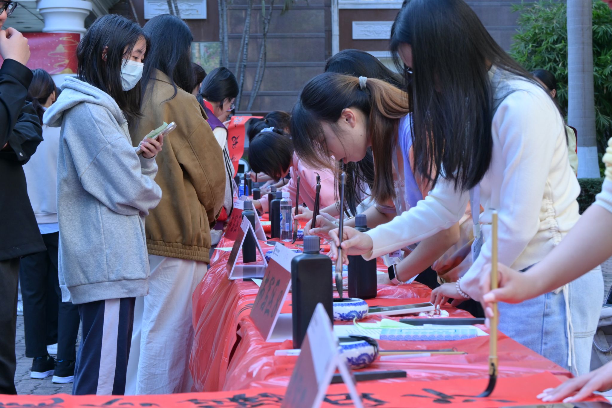 开幕式上,学校学生龙狮队奉上了充满活力的精彩表演。铿锵的锣鼓、翻腾的舞狮,迅速点燃了现场气氛,将师生带入浓厚的喜迎新春氛围之中。表演结束后,与会嘉宾与现场师生合影留念。随后,来自学生书画协会与校友书画协会的成员们挥毫泼墨,一幅幅寓意吉祥、笔力遒劲的春联和“福”字在他们笔下诞生。师生们纷纷驻足欣赏、排队领取,将美好的祝愿融入笔墨,带着红火春联与温暖笑意离开现场。